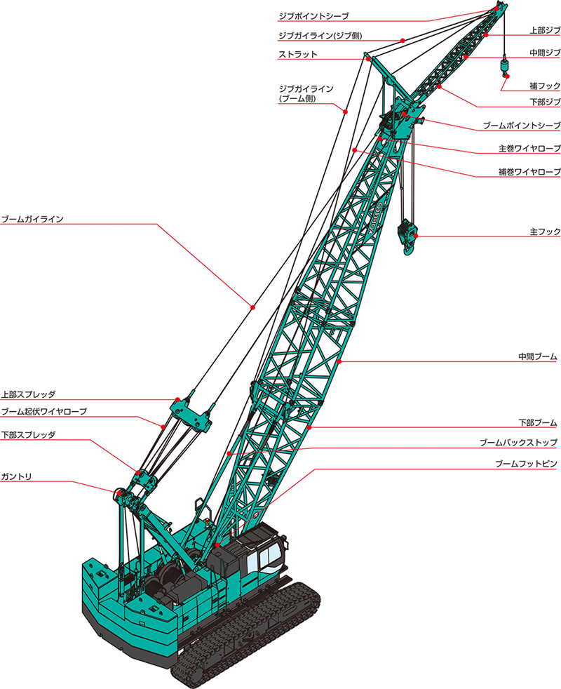 アタッチメントは作業装置とも呼ばれるように、直接荷をつって作業をする部分です。強度が高ければ高いほど、強度域でのつり上げ能力は大きくなりますが、強度を上げるためにブームを太くしたりすると、アタッチメントが重くなって重心が前へ移動し、安定性が低下します。 クローラクレーンのアタッチメントは、一部、ボックスブームもありますが、ラチスブームの先端にフックを取り付けたものが基本です。