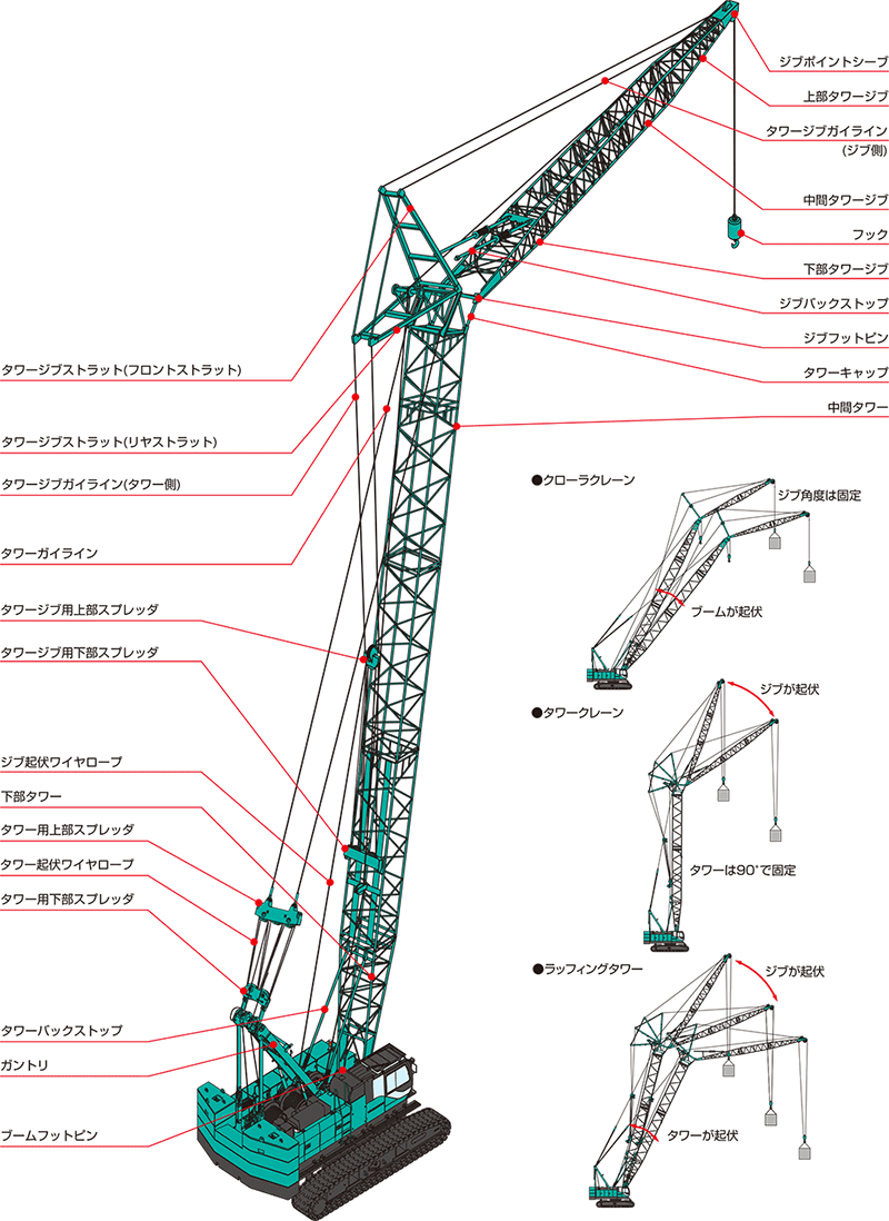 タワーもジブも能力表に指定された範囲の任意の角度で起伏させて使用することができます。タワーは、ブームトップ以外はクローラクレーンと共用できます。