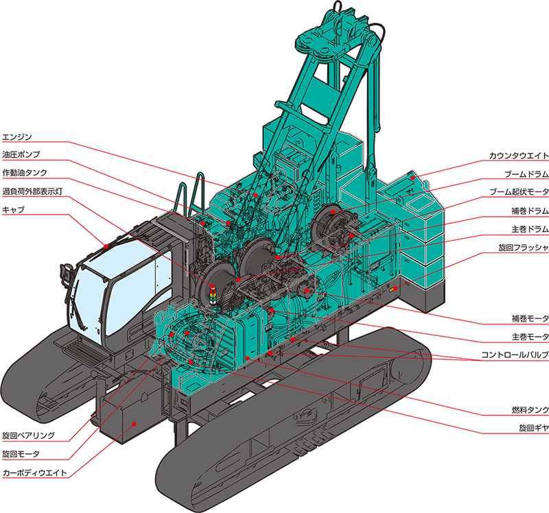 クローラクレーンは、クローラ式の走行装置の上に、クレーン装置+ラチスブームを搭載したもので、安定性がよく、軟弱地盤でも使用できるのが特長です。駆動方式は、機械式の時代を経て、現在ではほとんどの機種が、油圧式となっています。