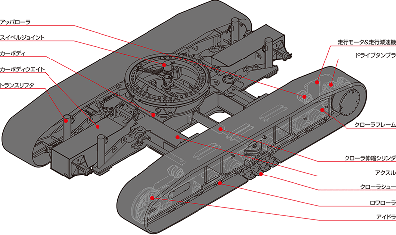 足回りは、つり荷やアタッチメント、上部本体の質量を支えるとともに、必要な場所に移動する役目があります。こうした足回りがあってはじめて、移動式クレーンと呼ばれるのです。クローラクレーンの走行装置は、クローラシューと走行モータ等の駆動装置から構成されています。