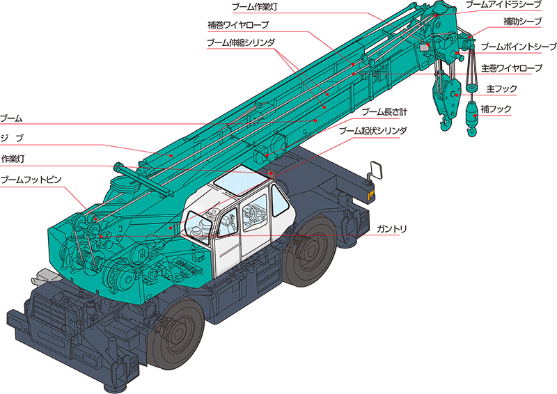 ここではホイールクレーンのうち、テレスコピックブームのクレーンであるラフテレーンクレーンを中心に、一部オールテレーンクレーンについて説明します。
