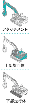アタッチメントは作業装置と呼ばれるように、直接、土を掘ったり、均したりして作業をする部分です。ブーム、アーム、バケットから構成され、これらはそれぞれ、油圧シリンダで動かされます。アタッチメントは、人間の腕と同じ原理で作られていて、ブームは上腕、アームは前腕、バケットリンクは手首、バケットは手のひらの働きをします。これらのフロントアタッチメントは、さまざまな形状のものに取り替えて、幅広い用途に使用できます。
