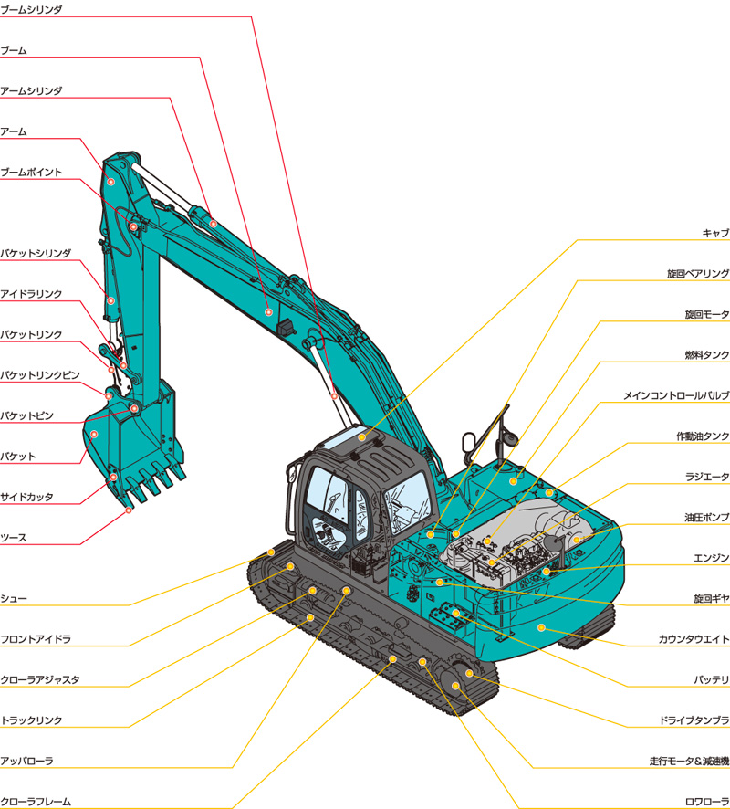 上部旋回体は主に、エンジンや油圧ポンプなどの動力源とそれらに付随する補器類で構成されています。基本的にはどの機種のショベルも同じ構造をしています。