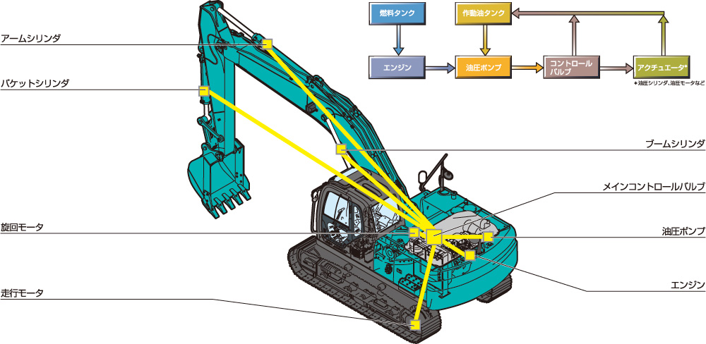 油圧ショベルはその名の通り、掘削、旋回、走行の全動作を油圧の力で行います。エンジンの出力軸の回転で油圧ポンプが駆動され、作動油が回路に押し出されます。作動油はメインコントロールバルブに送られ、ここで操作レバーの動きに従ってブーム、アーム、バケットの各油圧シリンダや旋回・走行油圧モータへ振り分けられます。
