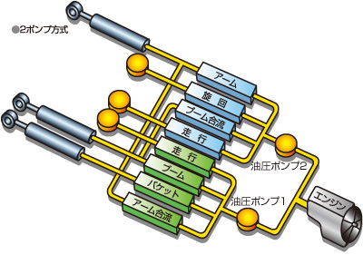 油圧ショベルは通常、2個の可変容量ピストンポンプを1台のエンジンで駆動し、油圧ポンプから吐出された作動油が4連+4連のメインコントロールバルブへ流れ込み、ここでレバー操作に応じて各油圧モータや油圧シリンダへ分配されます。 2個以上の可変容量ポンプを1台のエンジンで駆動する場合、エンジンの出力をどんな割合で各油圧ポンプに配分するかを決める方法をポンプ馬力制御といいます。また作業をしていないときやリリーフ時に油圧ポンプが無駄な作動油を吐出するのを防ぐためにポンプの吐出流量を低減するのがポンプ流量制御です。