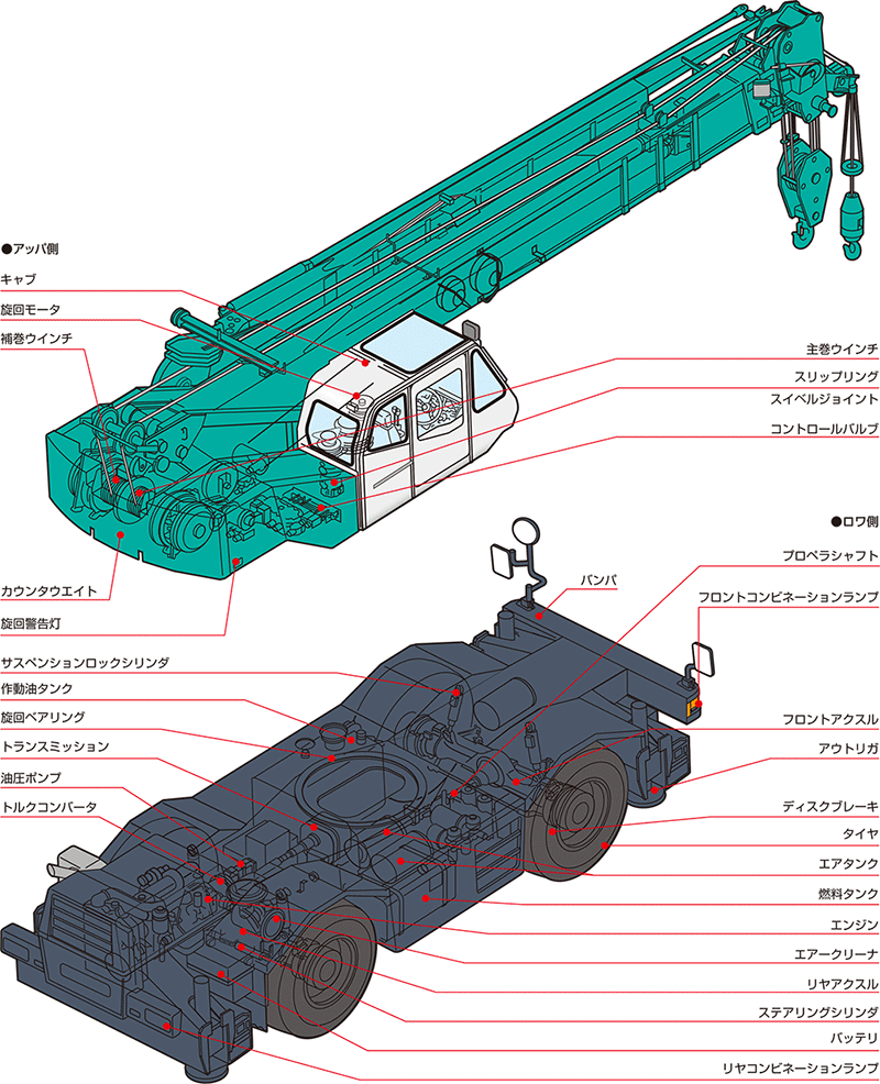 ラフテレーンクレーンの上部本体は、クローラクレーンと同じ360゚旋回タイプで、ブーム、キャブ、ウインチが搭載され、後端にはカウンタウェイトが搭載されています。キャリヤは、アウトリガが取り付けられている以外は、トルコン・オートマチックのトラックと同様の構造ですが、運転室がないため、キャリヤ単独では走行できません。オールテレーンクレーンは、上部本体にクレーン作業用、キャリヤに走行用のエンジンが、それぞれ搭載されています。キャリヤにも運転席がり、上部本体を取り外してキャリヤだけ道路を走行することができます。