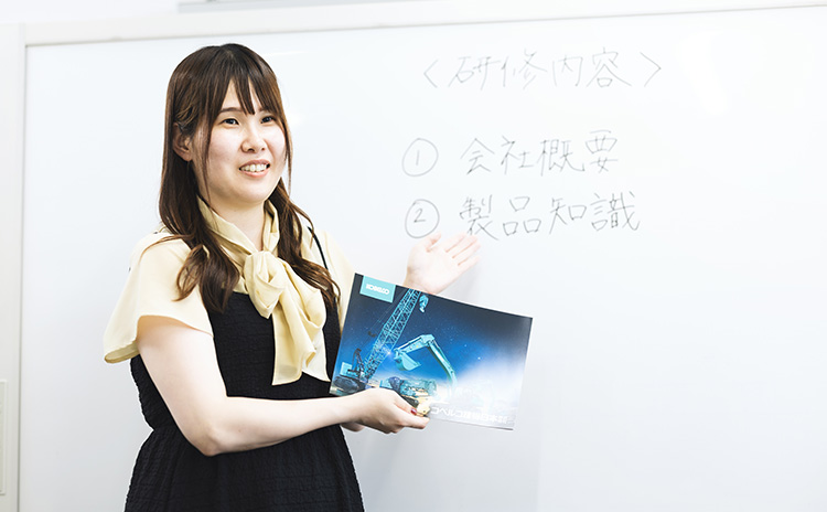 働く業界は決めていませんでしたが、人々の生活に役立つ仕事であり、かつ後方支援をする管理系総合職を目指していました。就職活動の中でコベルコ建機日本の求人に出合ったときに、思い出したのが東日本大震災の被災地で活躍する建機のこと。中学生でしたが、クレーンやショベルが暮らしの復興のために働く姿に感動しました。記憶と共に一気に興味が高まり、説明会や企業研究を重ねるほどに、自分の就職観にピッタリで、この会社で働きたいと思いました。面接の際には、私のコベルコ建機日本への熱い思いを語り、将来的には女性管理職になりたいと生意気なことも言ってしまいましたが、真摯に聞いてくださったのが印象に残り、内定をいただいた時は本当にうれしく思いました。
