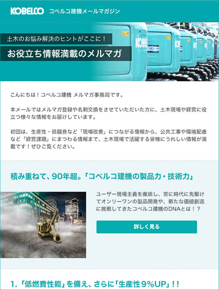 土木現場や経営に役立つさまざまな情報をお届けする、コベルコ建機メールマガジンを配信しています。最新製品・サービスの先行配信をはじめ、各地で開催される展示会情報やコベルコ建機オリジナルグッズまで旬のトピックを毎月配信。さまざまなお役立ち情報が満載となっていますので、この機会にぜひメルマガ会員へお申し込みください!