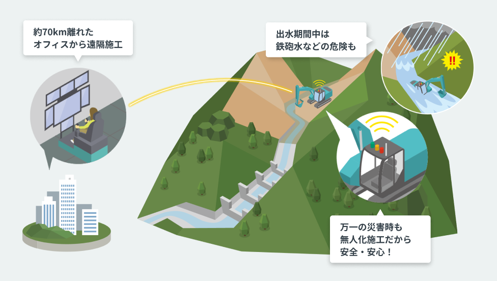 今回の現場は斜面の再崩落リスクから、出水期は人の立ち入りが禁止されており、安全確保のため無人化施工で工事を行う必要性があった。