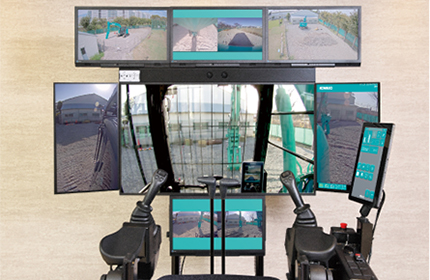 実機搭乗時のような操作性のコックピットから重機を操作し、安全快適な場所から現場作業を行うことができます。 また、クラウドに蓄積した稼働データが現場の課題を見える化し、現場の効率化を実現します。