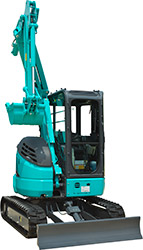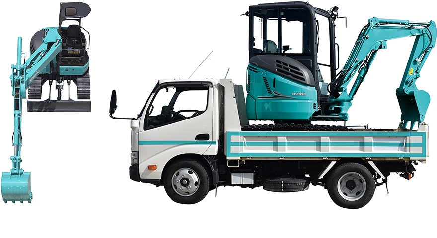 - 3トンダンプで運搬できる小型クラスから、壁際の側溝掘りがスムーズに進められるオフセットブーム搭載機など、現場のニーズに応じた機種を取り揃えています。
