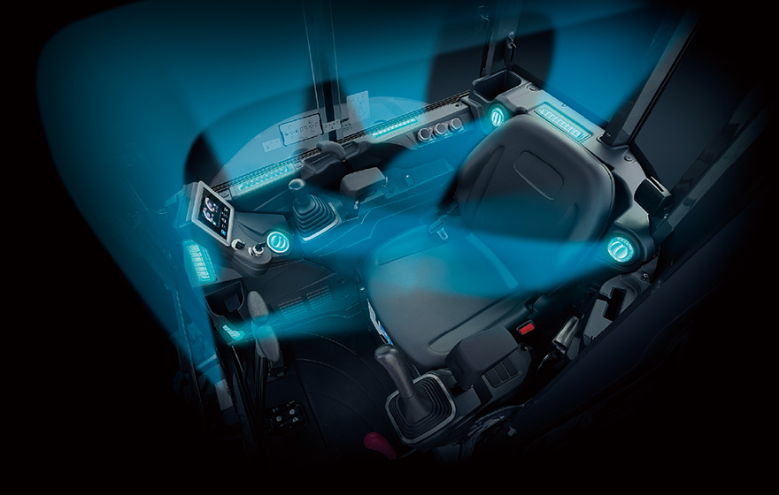 オプションのキャブ仕様にはエアコンを標準装備しており、コベルコ独自の全身を包み込むような風向制御により、偏った冷えや温熱を防止。熱中症対策などで選ばれる企業が増えています。