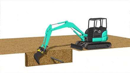 「チルトローテータ」オプション - バケットが45度チルト・360度回転するため、バケットが届かず人力で作業していた箇所や地中のパイプを避けた複雑な作業なども可能になり、移動回数が減少。作業効率が大幅に向上します。