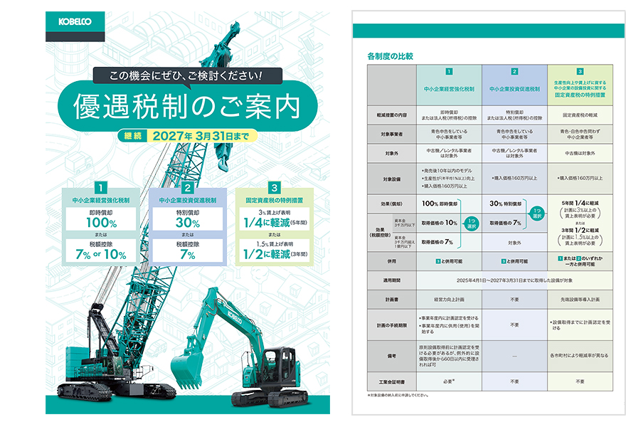 各種税制措置には条件がございますので、パンフレットにてご確認いただき、コベルコ建機の機械導入にお役立てください!