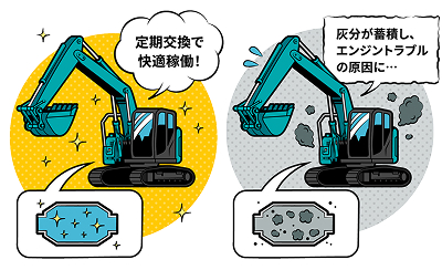 例:DPFを定期交換せずに使い続けると、稼働時間と共に燃えカス(灰分)が蓄積し、エンジントラブルの原因となります。